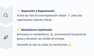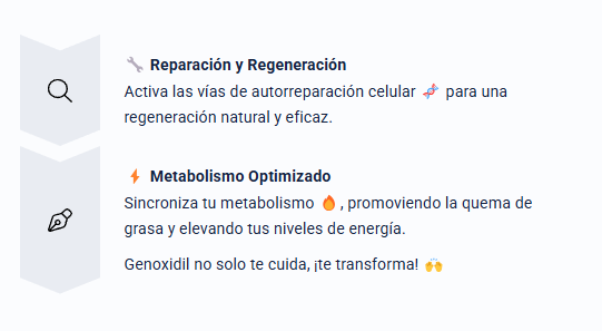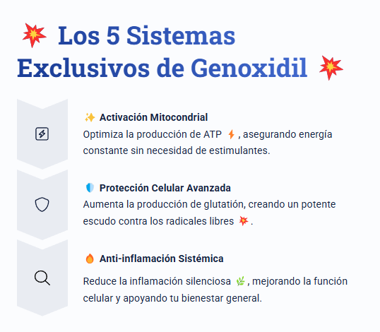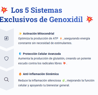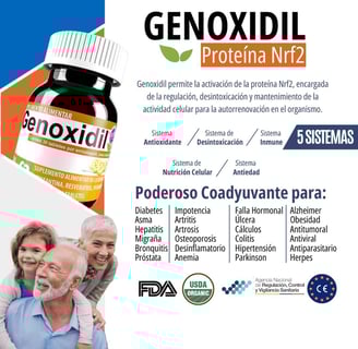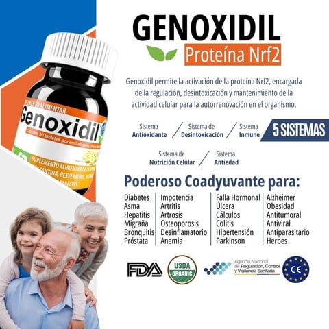🧠 Genoxidil activa la proteína Nrf2, el interruptor principal de tu cuerpo para combatir los 🧨 radicales libres y regenerar las 🧫 células desde adentro, haciendo que funcionen al 💯 en lugar de caer en la ⚠️ oxidación celular y 🧟♂️ enfermedades degenerativas.